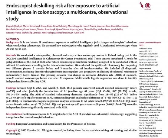 Pragniemy poinformować, iż lekarz naszej Przychodni, Paweł Kołodziej, jest jednym ze współautorów artykułu opublikowanego właśnie na łamach renomowanego czasopisma The Lancet Gastroenterology & Hepatology! Praca badająca zastosowanie sztucznej inteligencji podczas wykonywania badań endoskopowych powstała jako część realizowanego przez Endomed międzynarodowego projektu badawczego ACCEPT/OperA i byłą oddolną inicjatywą polskich badaczy, m.in. właśnie lek. Pawła Kołodzieja.